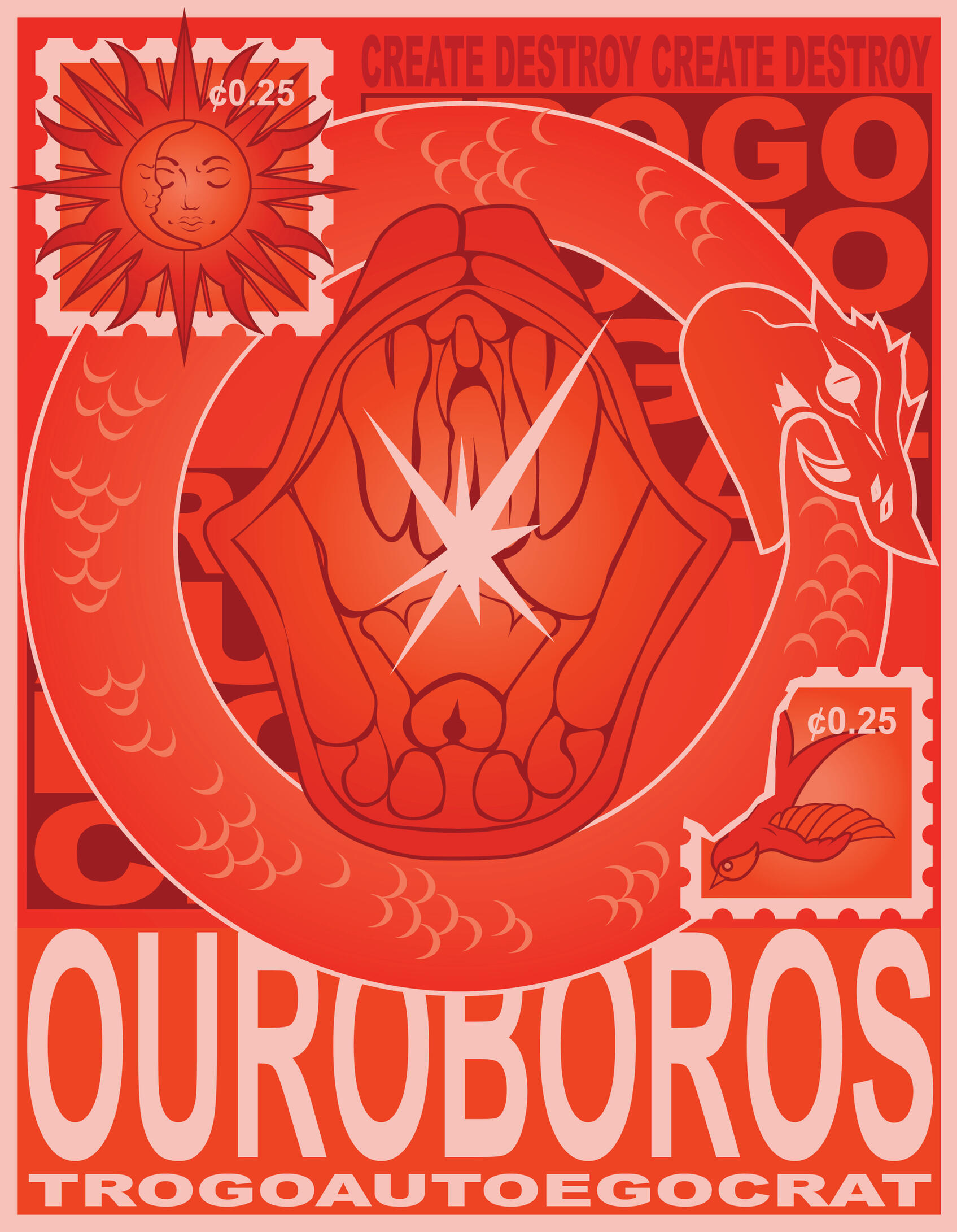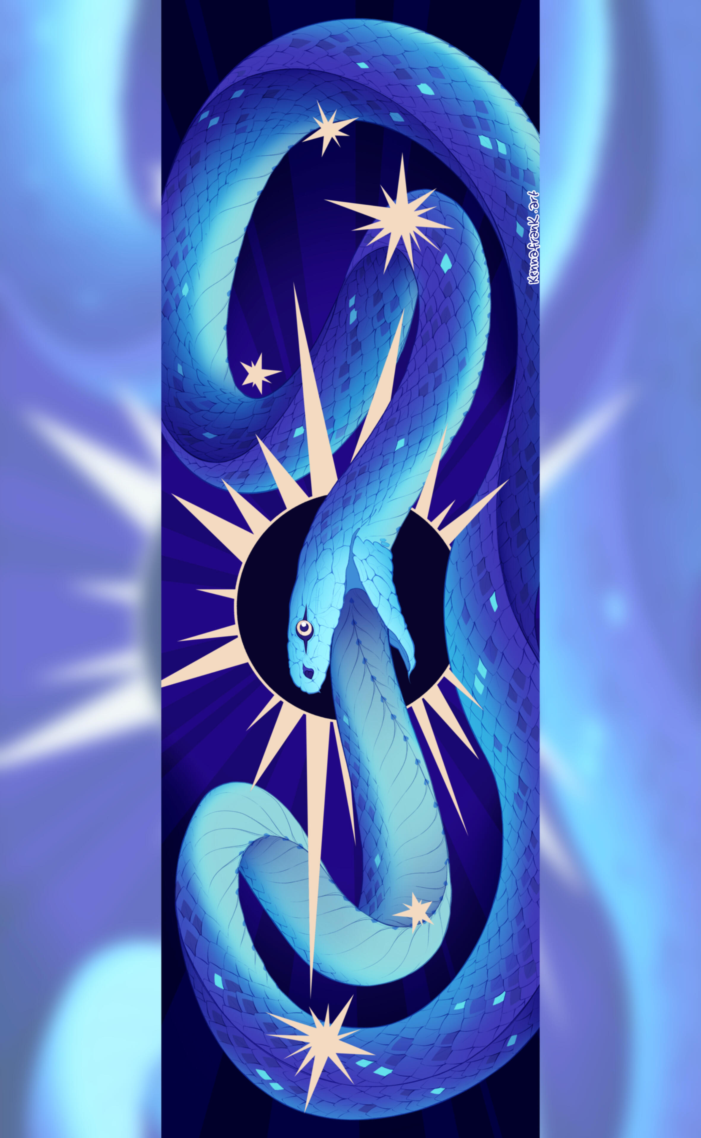 The theme for the 2026 Rides and Tides as unity in action. The competition mentioned movement, individuality, and the constant equilibrium between opposites. I immediately thought of my favorite symbol, Ouroboros, and the philosophy of Trogoautoegocrat: reciprocal maintenance, and energy returning to it's origins. Much like waves, returning to the sea, or the sun dipping below the horizon once again, ouroboros eating itself represents the idea of unity, especially in action. When it happens in real life, and sometimes it does, the snake never stops moving, and can and sometimes will consume itself until it dies. A return of energy.I have also, behind the snake, included the lunar eclipse. What exemplifies unity in action better than two opposites coming together to be a beautiful phenomenon.And moreover, I chose blue to symbolize harmony and calmness, furthering the feeling of unity.
