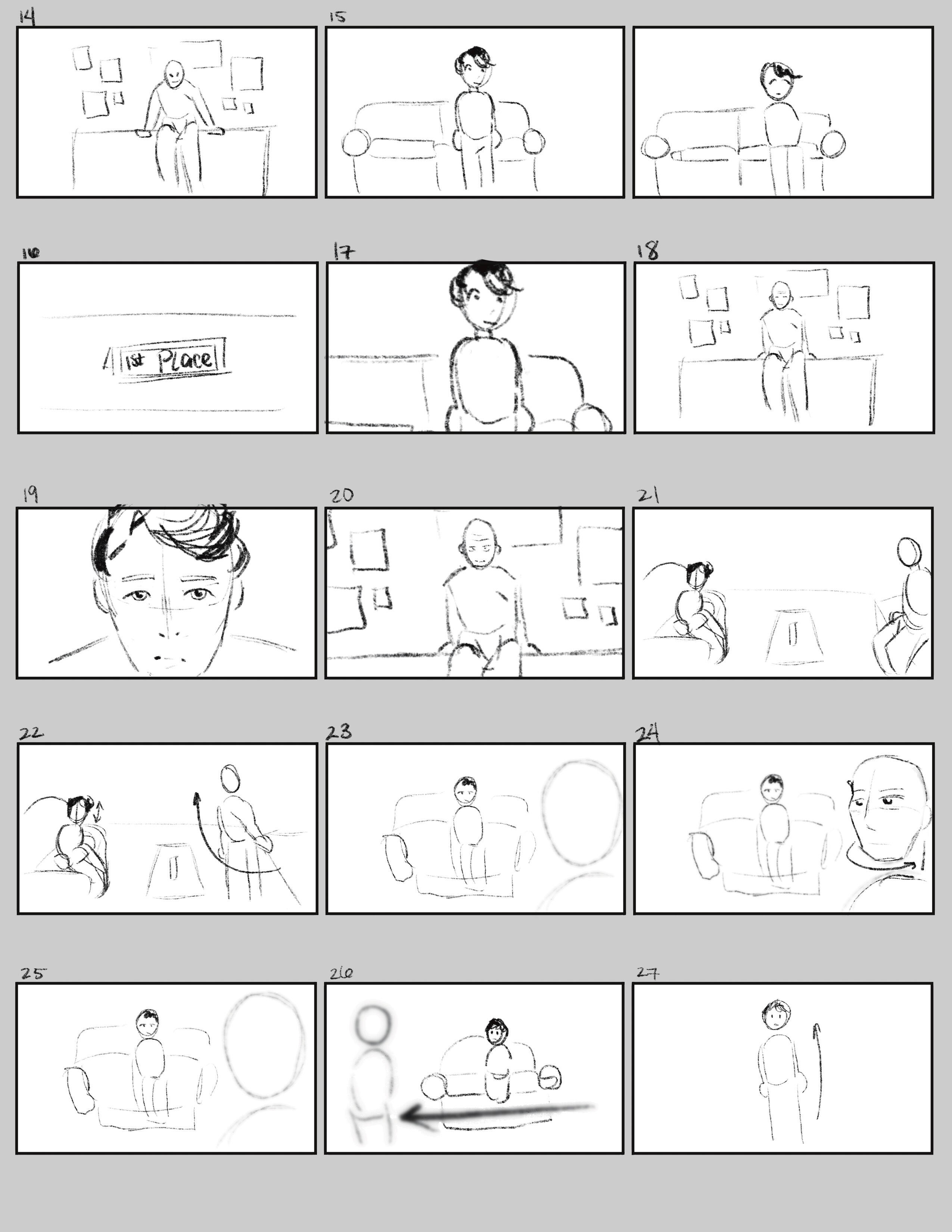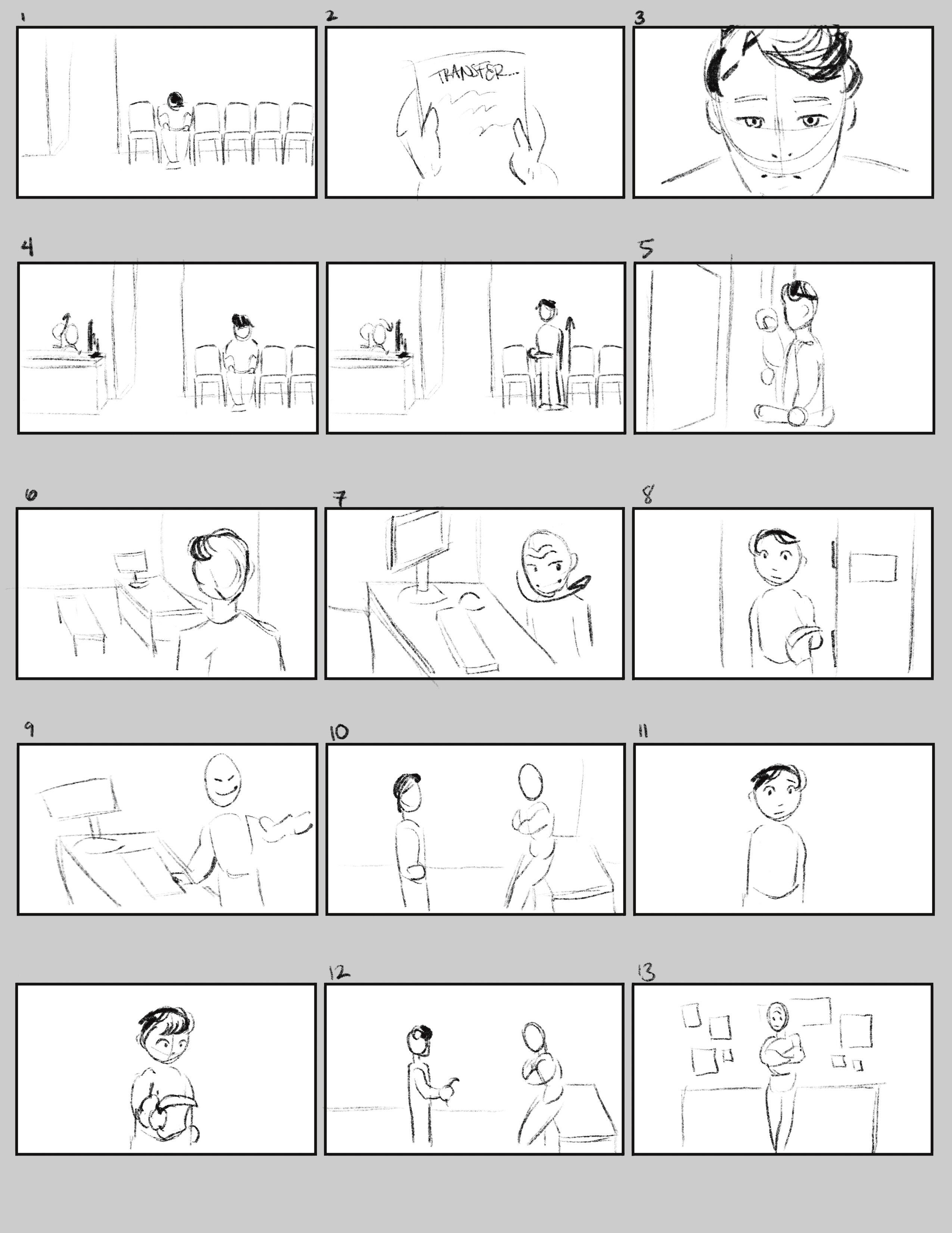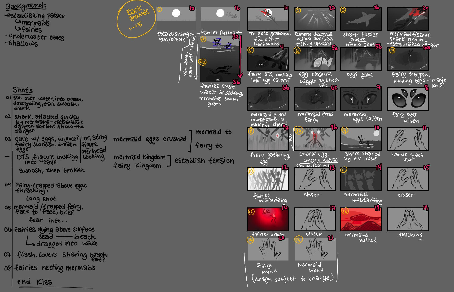 Collaboration between Fio Rizvi and myself. Concept was created by both of us: I did storyboard thumbnails, backgrounds, character design, and the shark character in the boards.